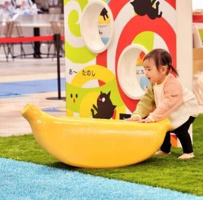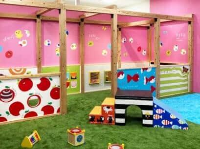 18か月までの乳幼児専用エリアなので、ハイハイのお子さまでも安心して楽しめます。「しましまぐるぐる」絵本や壁掛け遊具などを完備。