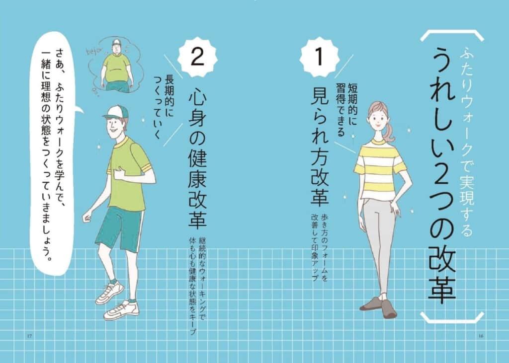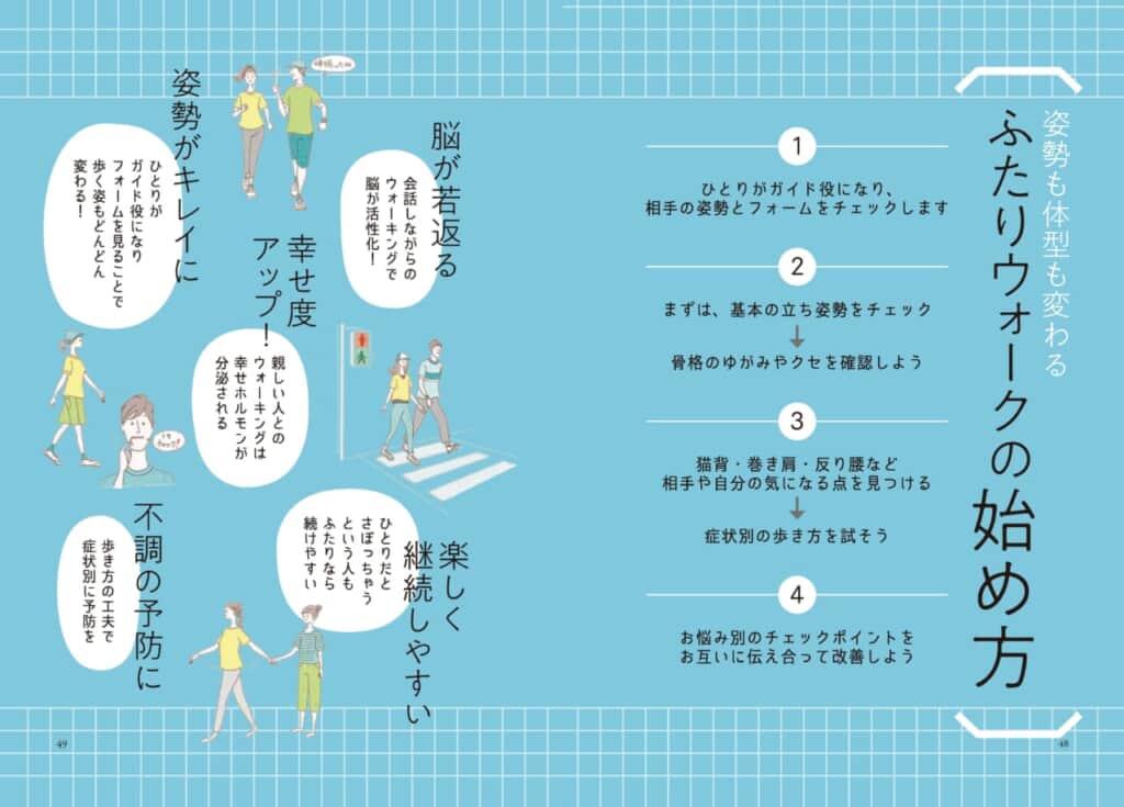 健康増進効果として、「ふたりで歩く」という新しいコミュニケーションの場を設定することで、WHOが示す「心身ともにも満たされた真の健康」を目指す一冊となっています。