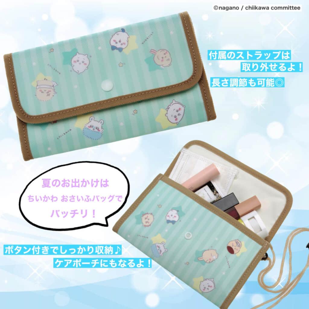 涼し気なエメラルドグリーンのカラーが◎。長さ調節&取り外しできるストラップ付きで、おさいふ、ケアポーチ、ペンポーチなど、いろいろな使い方ができるよ。内部には仕切りもついているからカード類の整理にも便利。