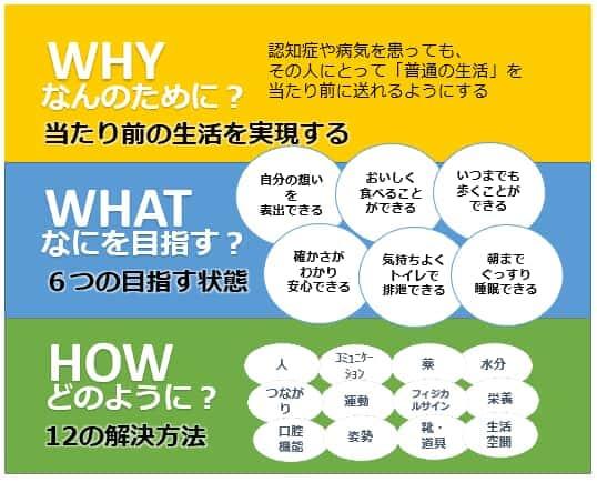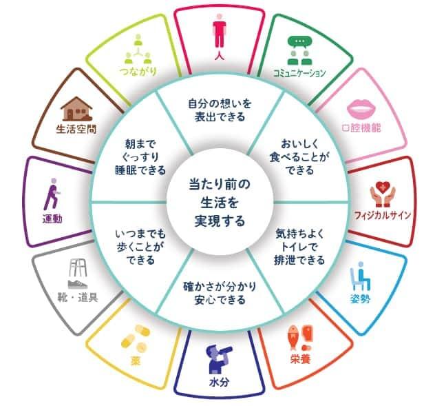 生活課題に直結する要素を「6つの目指す状態」として設定。おいしく味わえる食事状態やトイレでの排せつ、自分の足でしっかりと歩ける歩行状態、快適な睡眠など身体面での状態改善や、自分の望み・想いを表出できる状態をつくること、また、認知症の方の「不確かさ」で「不安」な状況を「確か」で「安心」できる状況にすることなど、この6つが整うことで「当たり前の生活を実現する」ことにつながると考えています。