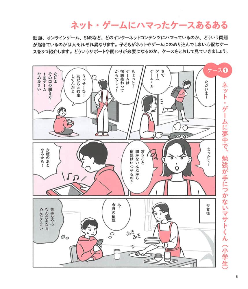 子どもがネットやゲームをなかなかやめないために、親子げんかが絶えないという家庭も。本書では、親子の間でよくある事例を漫画で紹介し、わかりやすく解説しています。子どもへの声かけのしかたや、子どもが守りやすいルール作りのコツもわかります。