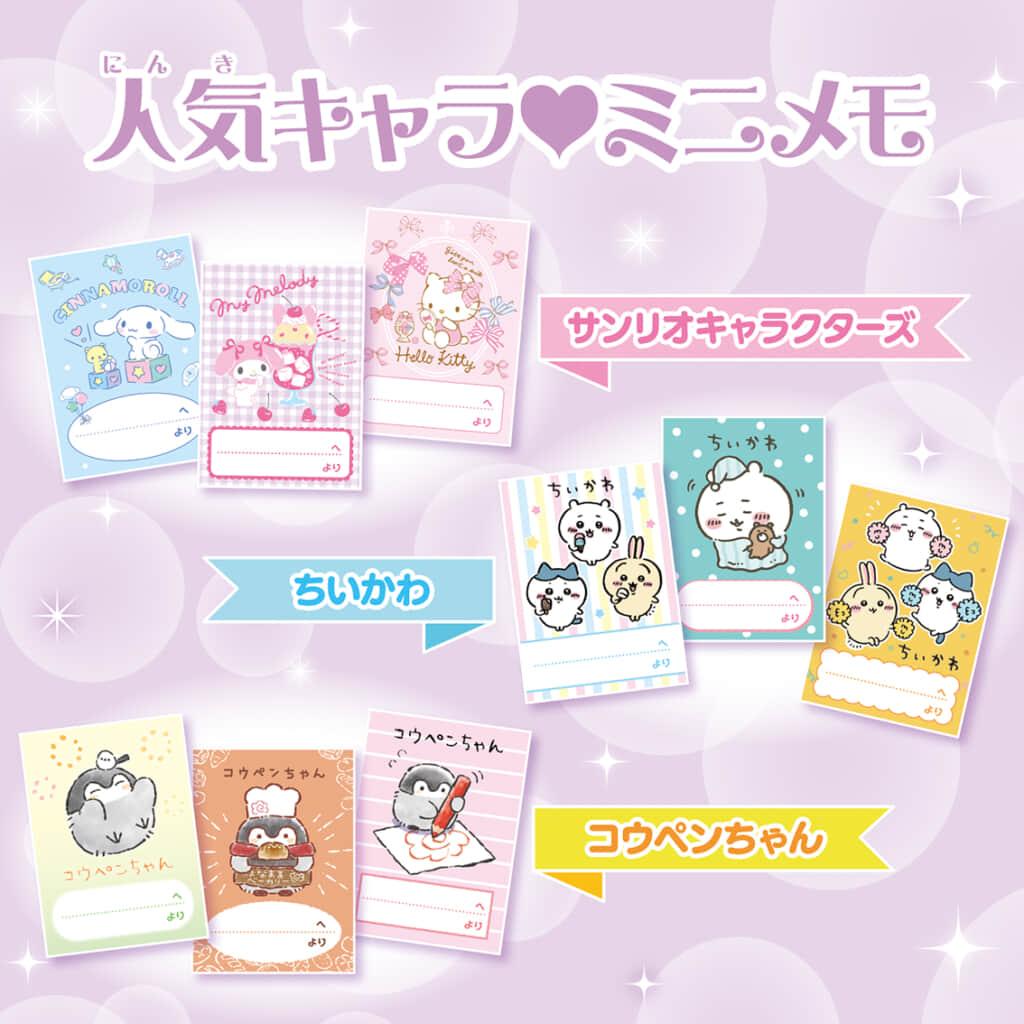 人気キャラクターのミニメモもたっぷり付いています。ハローキティ、マイメロディ、シナモロールのかわいいメモが1枚ずつ、ちいかわのポップなメモが3枚、コウペンちゃんのほっこりかわいいメモが3枚の合計9枚。お友だちへのおてがみなどに大活躍することまちがいなし!