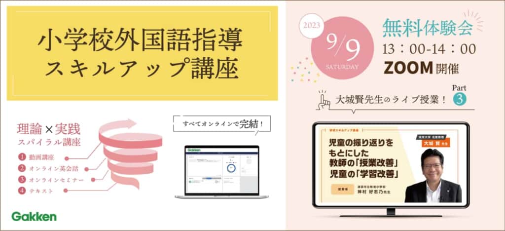 株式会社 学研ホールディングス(東京・品川/代表取締役社長:宮原博昭)のグループ会社、株式会社 Gakken(東京・品川/代表取締役社長:五郎丸徹)は、小学校の教員向けのオンライン研修講座「小学校外国語指導スキルアップ講座」の無料体験会(2023年9月9日開催)の受付を開始いたしました。