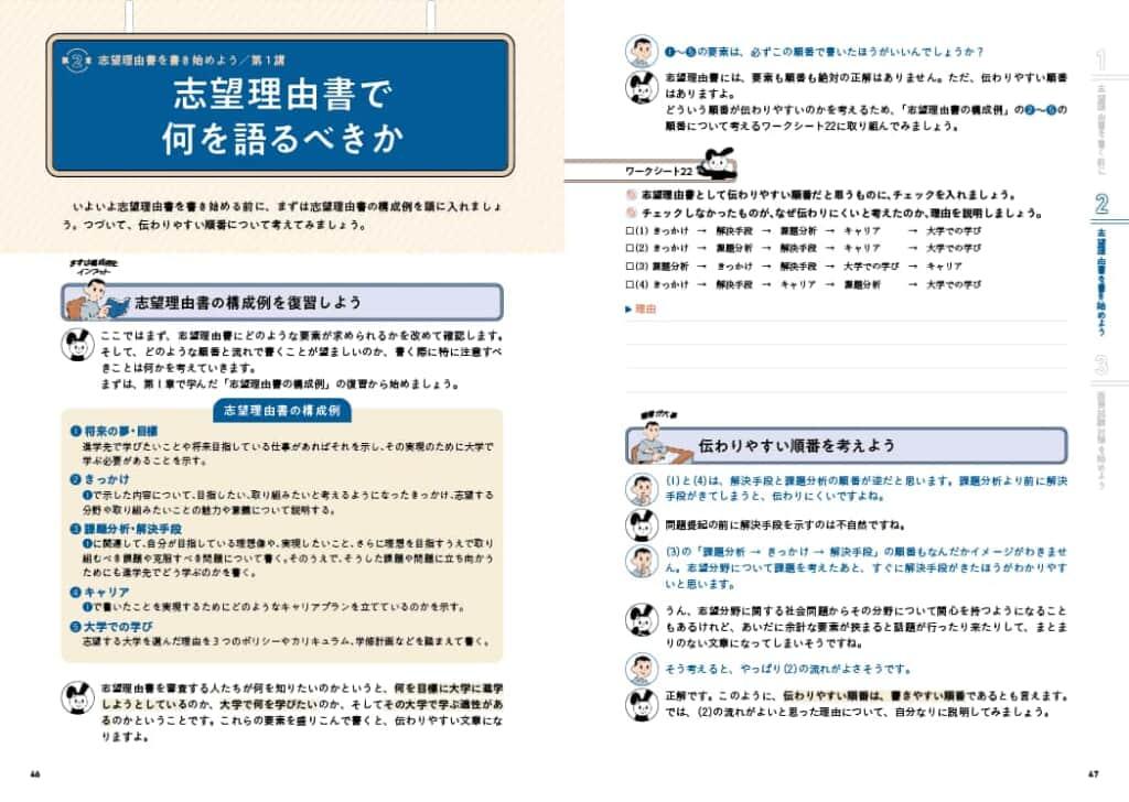 「活動実績も明確な志望理由もない……」「文章がまとまらない……」「そもそも、志望理由書ってナニ!?」そんな悩みを抱える高校生も多いのではないでしょうか。知識ゼロからでも無理なく対策できるように、埋めていくだけで志望理由書が完成するワークシートが充実しています。