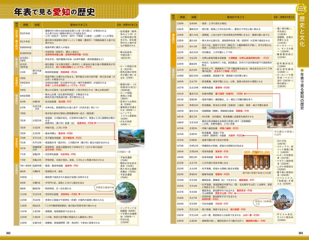 地球の歩き方の国内シリーズは、流行り物を極力そぎ落とし、地元の方にとっても新たな発見があるように、歴史や伝統・文化の紹介を充実させています。愛知の歴史年表は、本書掲載の店や観光スポットにもリンクしているので、歴史の舞台を歩くことも可能! 巻末には愛知の方言や「あるあるネタ」のミニコラムも。