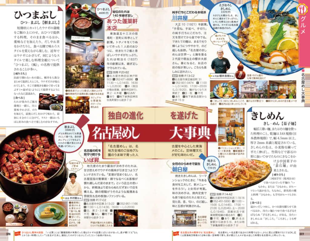 ひつまぶし、きしめん、味噌かつ、味噌煮込みうどん、台湾ラーメン、あんかけスパなど、押さえておきたい定番の名古屋めしは発祥の歴史から解説。スガキヤ、若鯱家など愛知生まれのチェーン店や、シブくてウマい老舗の逸品まで、胃袋の限界に挑戦したくなる愛知グルメが満載!