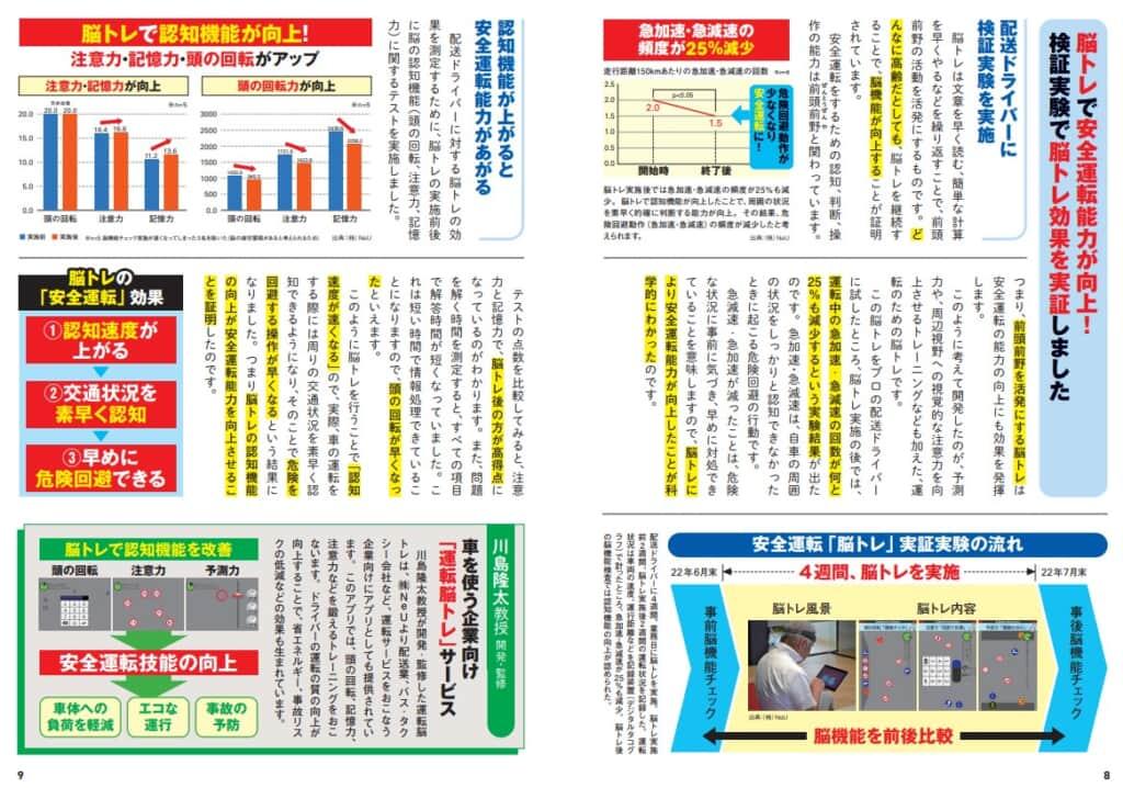 川島隆太教授の研究チームは配送ドライバーに脳トレを実施したところ、急加速・急ブレーキが何と25%も減少するという実験結果に! 急加速・急ブレーキは安全確認の遅れによる危険回避行動ですから、脳トレの認知機能向上によって安全運転能力が上がることが科学的に証明されたのです。