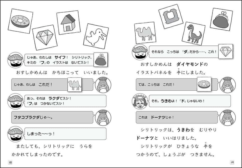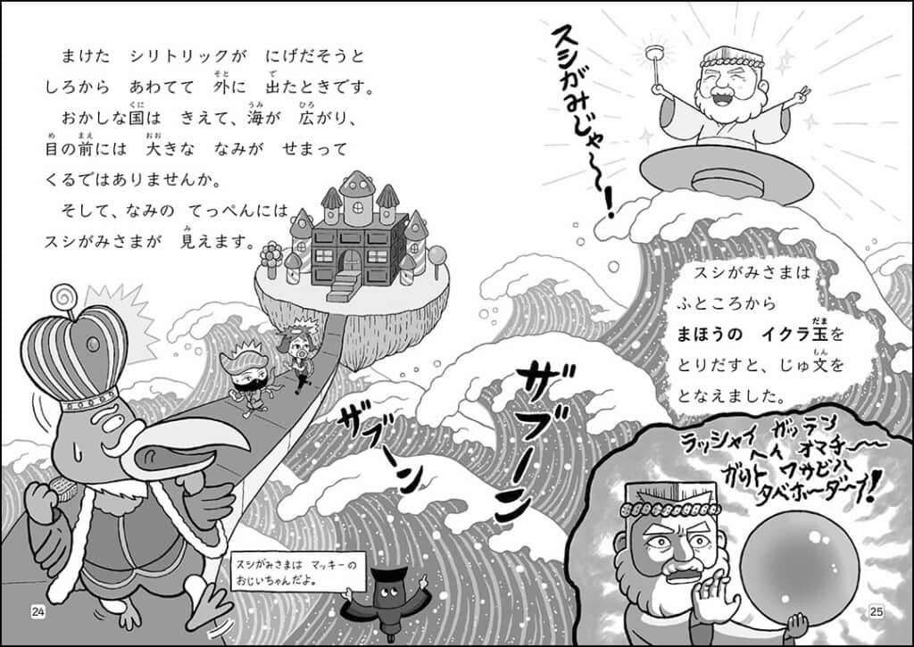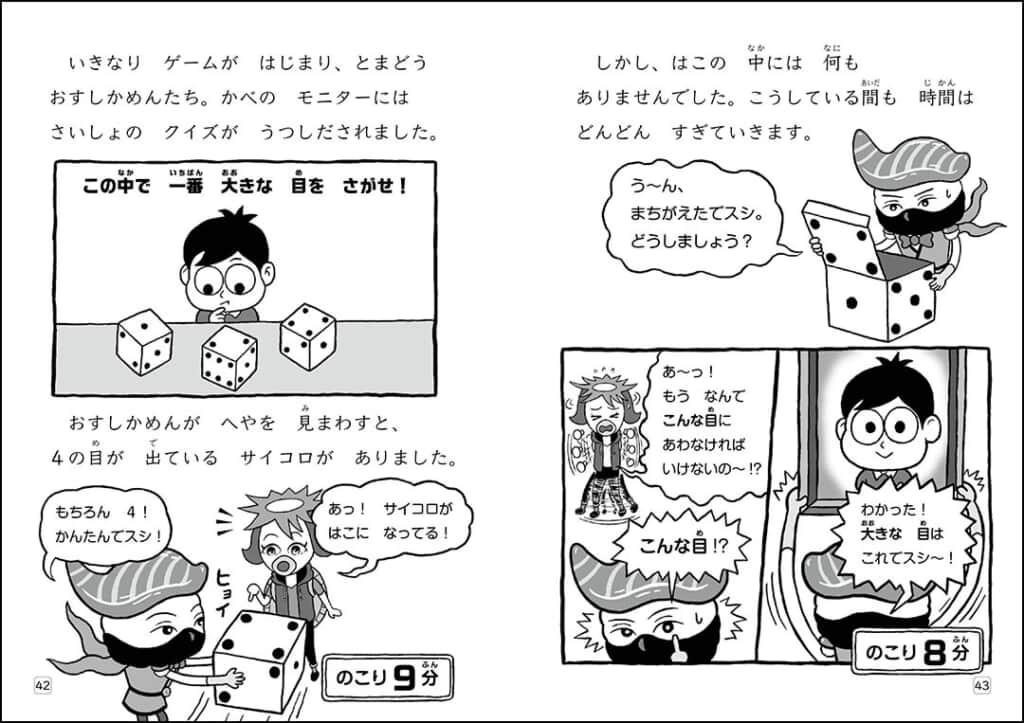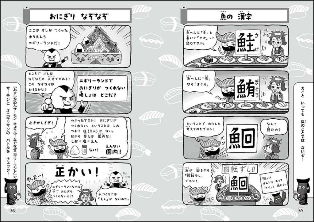 今回、「あそび」の要素をより気軽に、ジェットコースターのように楽しめる短編エピソード2本(「しりとりかい人とおかしな国」「だっ出!ニセヒーローのなぞときハウス」)と、お寿司と魚のマメ知識も学べる4コマまんがを収録したソフトカバー書籍が発売されます。