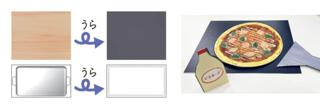 - 両面使える巻末ボードは木目調の裏側が鉄板、銀のトレイの裏側がペーパーナプキンとなっています。お寿司やサンドイッチをのせたり、ピザを焼いたり……。