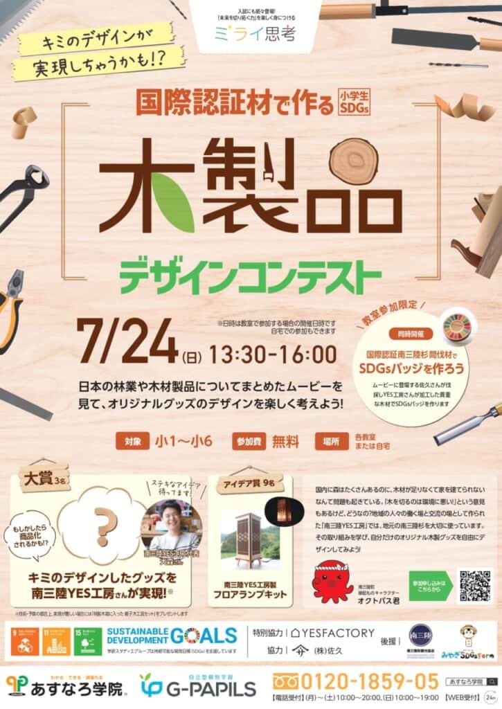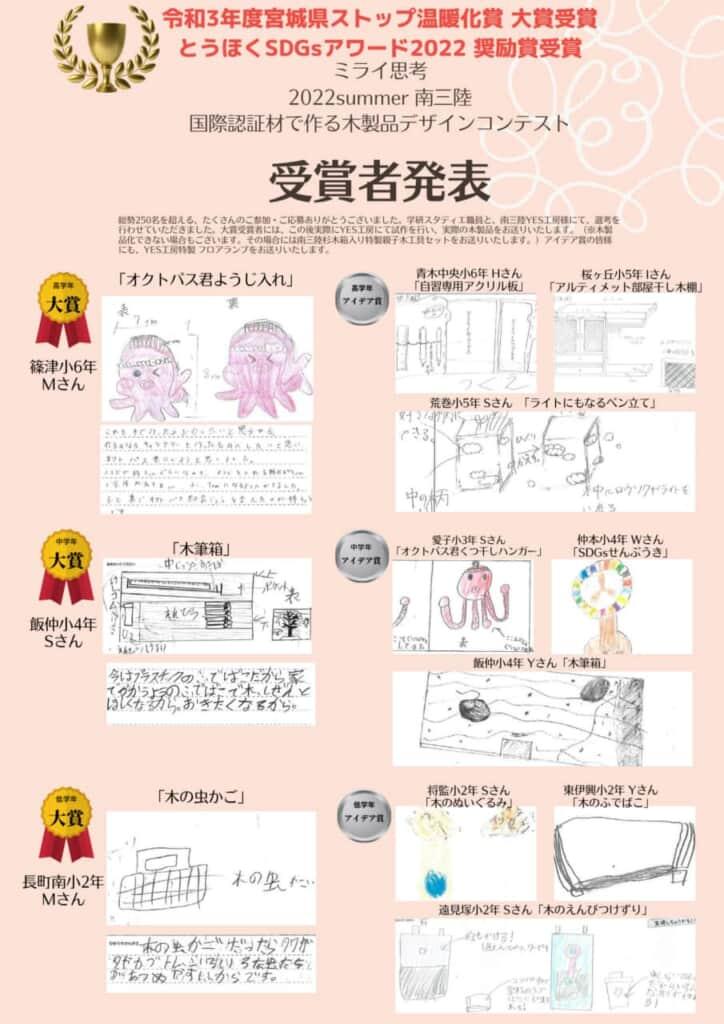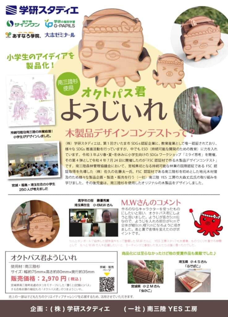 株式会社 学研ホールディングス(東京・品川/代表取締役社長:宮原博昭)のグループ会社、株式会社 学研スタディエ(さいたま市/代表取締役社長:亀谷眞宏)の展開する埼玉県の進学塾サイン・ワン、宮城県の総合進学塾あすなろ学院、福島県の大志ゼミナールでは、令和4年7月、一般社団法人 南三陸YES工房(宮城・南三陸町/代表理事:大森丈広)らの協力のもと、「FSC認証材で作る木製品デザインコンテスト」を開催。約250名の児童が参加しました。そして今回、子ども達のクリエイティブチャレンジを応援するため、高学年の部受賞者のデザインを、南三陸YES工房の実店舗・ECサイトにて、期間限定販売することになりました。
