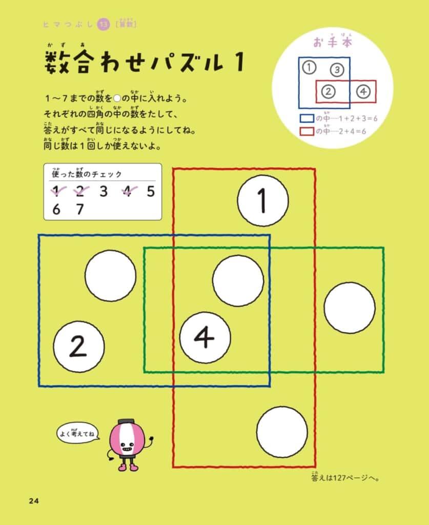 - 7つの数字を入れるだけなのに難しい「数合わせパズル」。『天才!!ヒマつぶしドリル ふつう』p24より。