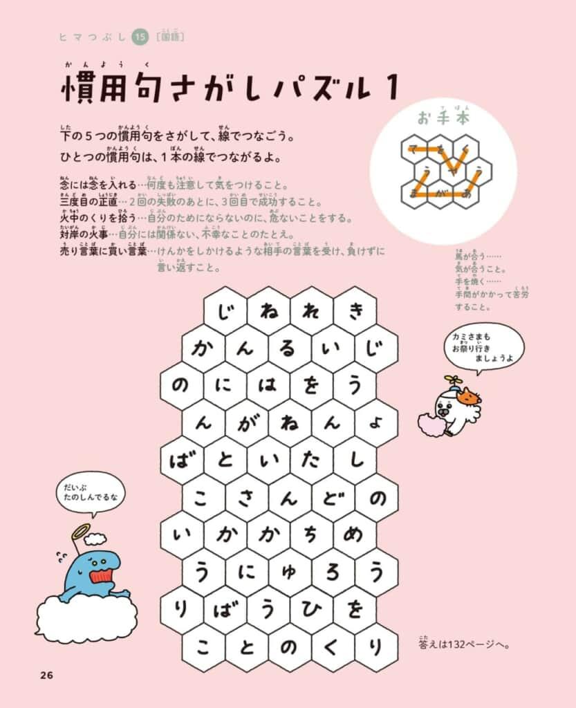 - 解くうちに5つの慣用句を覚えられる「慣用句さがしパズル」。『天才!!ヒマつぶしドリル ふつう』p24より。