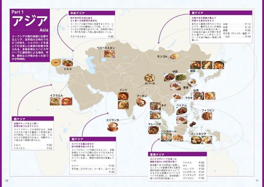- アジア・ヨーロッパ・アメリカ・アフリカ・オセアニアのエリアごとにマップを掲載。気候条件のほか、移民や交易などの歴史が、
