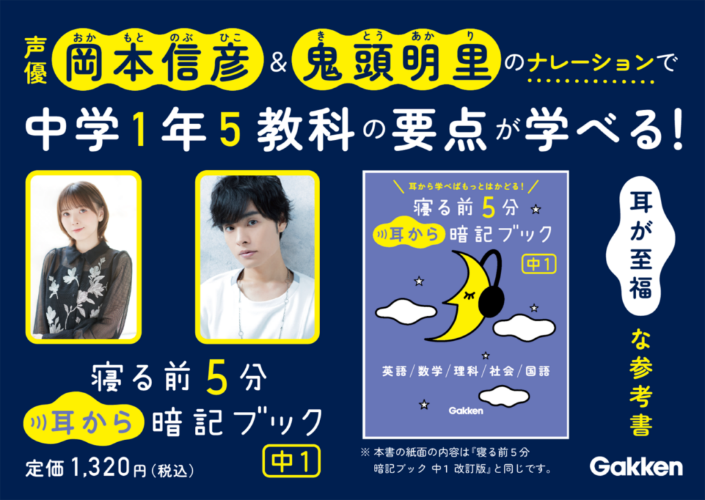株式会社 学研ホールディングス(東京・品川/代表取締役社長:宮原博昭)のグループ会社、株式会社 Gakken(東京・品川/代表取締役社長:五郎丸徹)は、2023年9月14日(木)に、声優・岡本信彦さん&鬼頭明里さんの音声つき『寝る前5分耳から暗記ブック 中1』を全国の書店・ネット書店で発売しました。また、シリーズ他商品をお買い上げの方を対象に、お二人の応援メッセージボイスをお聞きいただけるキャンペーンを全国の書店で開始しました。