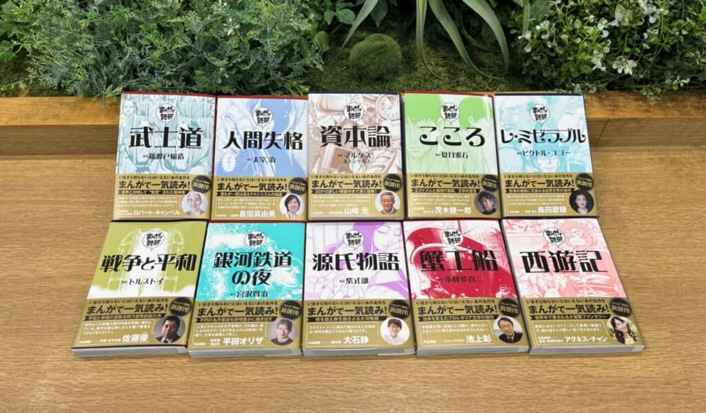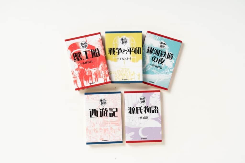 - 上段:9月発売の『武士道』、『人間失格』、『資本論』、『こころ』、『レ・ミゼラブル』。下段:7月発売の『戦争と平和』、『銀河鉄道の夜』、『源氏物語』、『蟹工船』、『西遊記』。