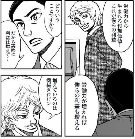 「労働者は、自分が生産する価値よりも安い賃金で働くことによって、資本に剰余価値(=利益)をもたらします。資本は労働者から利益を得て、その一部を銀行などの債権者に利子の形で支払い、残りが資本家のものになります。そして、うまくいっているビジネスでは資本家の取り分が大きくなるのです。