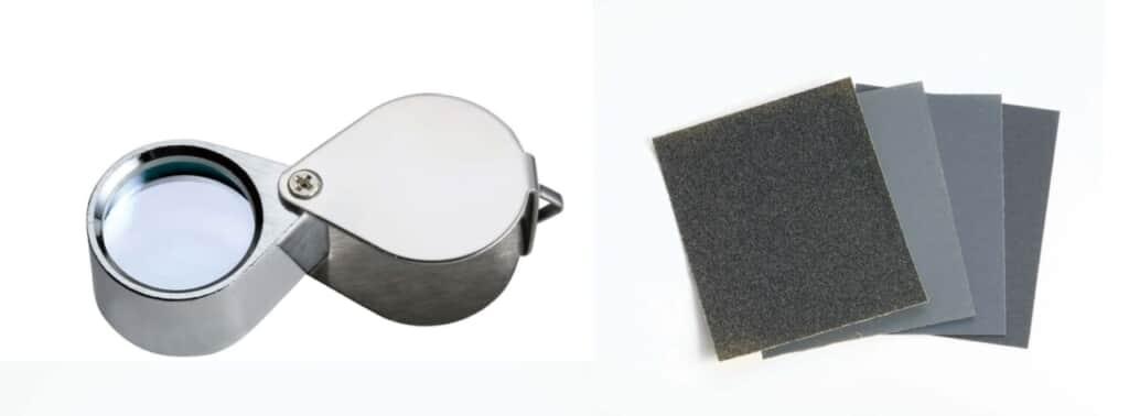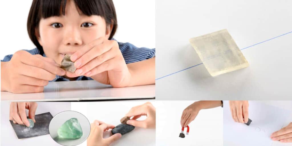 鉱物と岩石(12種類:蛍石、方解石、コランダム、石墨、雲母、磁鉄鉱、タイガーアイ、紫水晶、ローズクォーツ、かんらん石、花崗岩、玄武岩)、メタルルーペ(倍率10倍)、耐水ペーパー(4枚)、標本ケース、標本ラベル。
