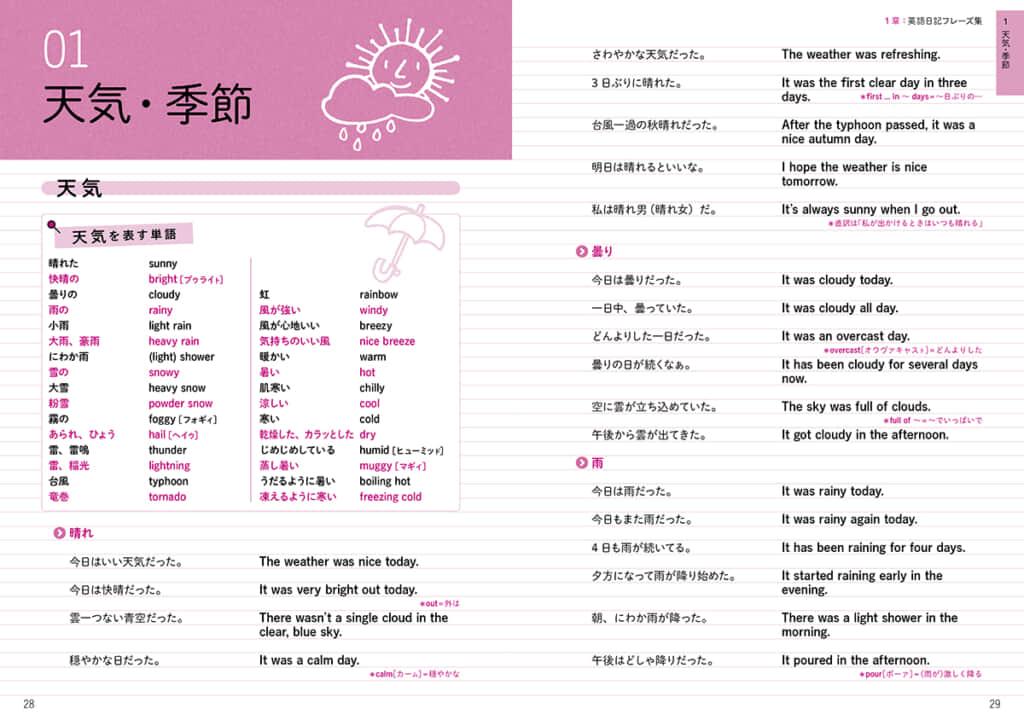 英語日記フレーズ集の掲載ジャンルは下記の通り。ページをめくってみるだけでも楽しい!