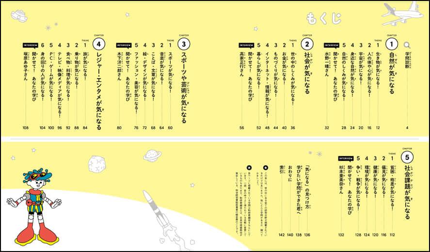 - 『学問図鑑』のもくじ。「サイエンスアゴラ2023」では、出展ブースがこの①~⑤の5つのトピックごとに配置される。