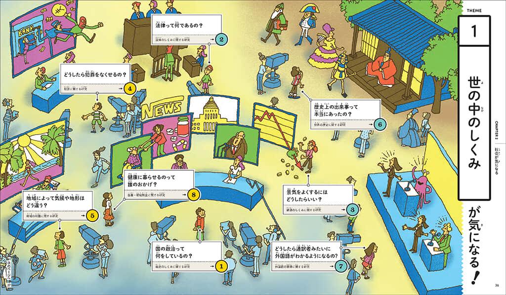 - 『学問図鑑』1章のページ。前のページのイラスト中の問いが、さまざまな学問につながっていることを知ることができる。