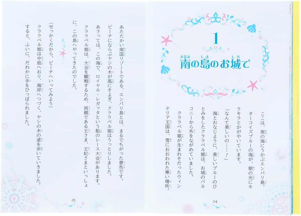 南の島で開催される、船のレース大会を観戦するため、公務として赴く両親に、クララベル姫も同行します。そこで、仲良しの他の国の王女さまと再会して、喜んだのもつかのま…。彼女たちと結成している「ティアラ会(冒険や友情のコミュニティ)」の訓練をしよう、ということになるのですが…。