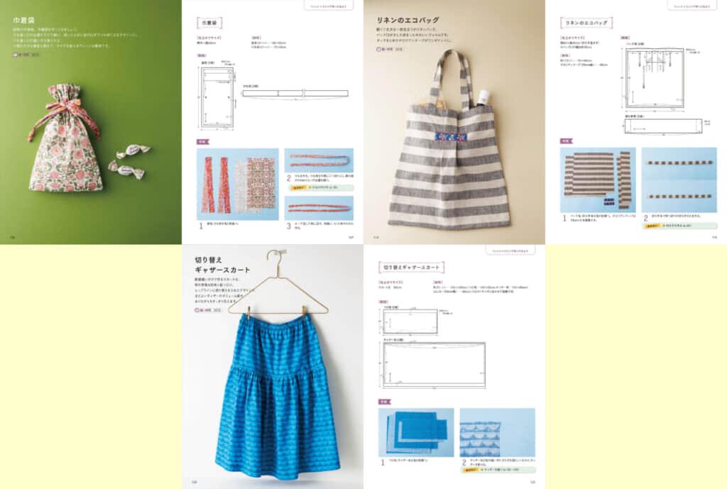 - 袋物の王道の巾着袋や、リネンで作った軽くて丈夫な一枚仕立てのエコバッグ、直線縫いだけで作れるギャザースカートなど、