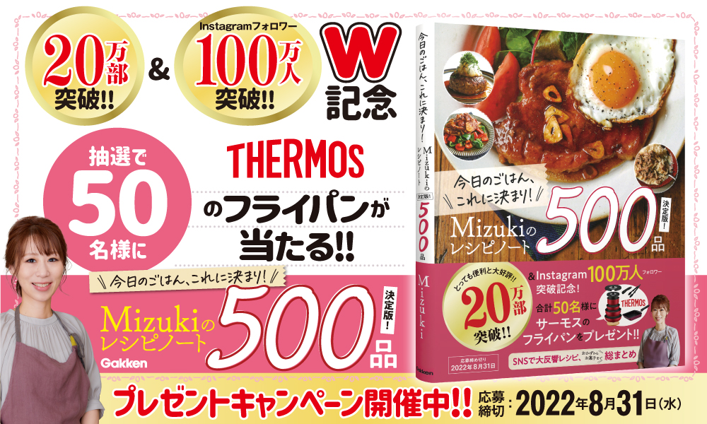 • 【サーモスのフライパンを抽選50名様にプレゼント】『Mizukiのレシピノート』20万部突破&Mizuki Instagramフォロワー100万人突破記念キャンペーンを開催 2022年06月07日 【サーモスのフライパンを抽選50名様にプレゼント】『Mizukiのレシピノート』20万部突破&Mizuki Instagramフォロワー100万人突破記念キャンペーンを開催