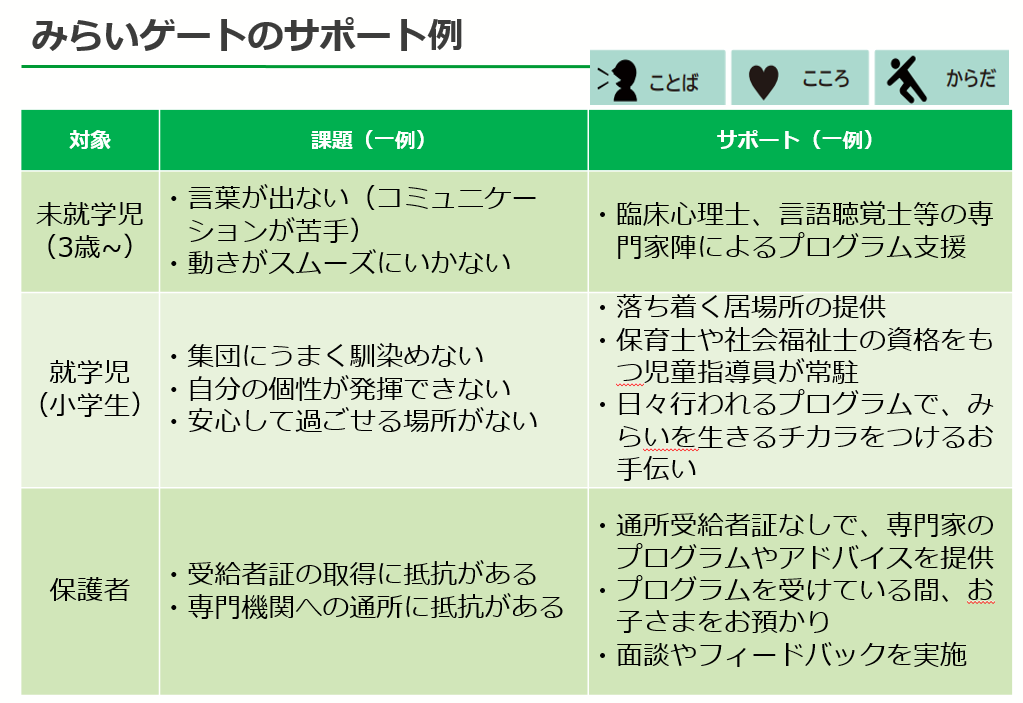 - 「学校」「家庭」に続く第三の居場所を目指す、みらいゲートのサポート例。子どもたちに対してはからだ、ことば、こころのサポートを行い、保護者からの相談にも対応する。