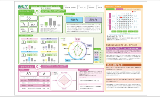 また、「思考力・判断力・表現力」を見える化するアセスメント「明日の学力」診断(「あすがく」)を年に2回実施しており、年間10万人が受検しています。