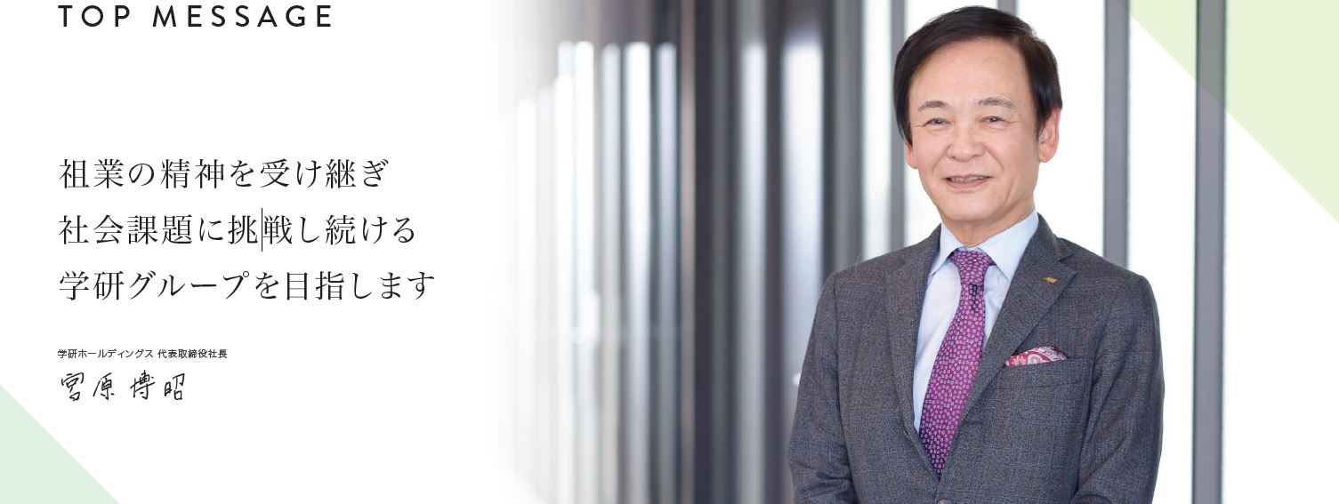 1959年生まれ。広島県呉市出身。防衛大学校卒業後、貿易商社を経て、1986年に株式会社学習研究社(現学研ホールディングス、以下学研HD)入社。学研教室事業部長、執行役員、取締役を歴任し、2009年学研HD取締役に就任。学研塾HD(現学研教育HD)、学研エデュケーショナル、学研教育出版(現Gakken)の代表取締役社長兼任を経て、2010年12月、学研HD代表取締役社長に就任。教育と医療福祉を中核とした事業改革を牽引し、15期連続増収のV字回復を果たした。現在は、日販グループホールディングス株式会社社外取締役、公益財団法人古岡奨学会理事長、一般社団法人日本雑誌協会理事長などを務める。