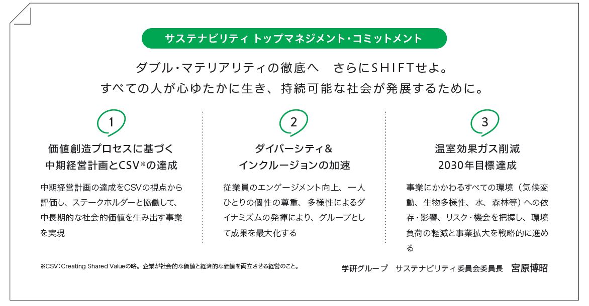 学研グループは、2025年9月期期首に上記のようなサステナビリティ・トップマネジメント・コミットメントを示しました。