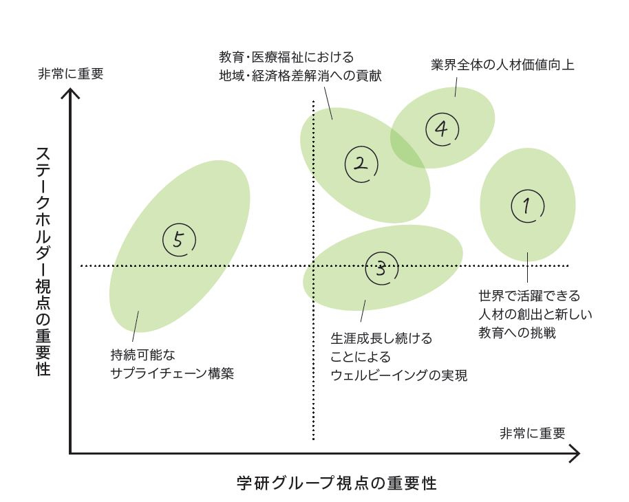 二軸の重なりにあたる項目だけでなく、学研グループが持つユニークな価値観も取り入れて特定したこと。