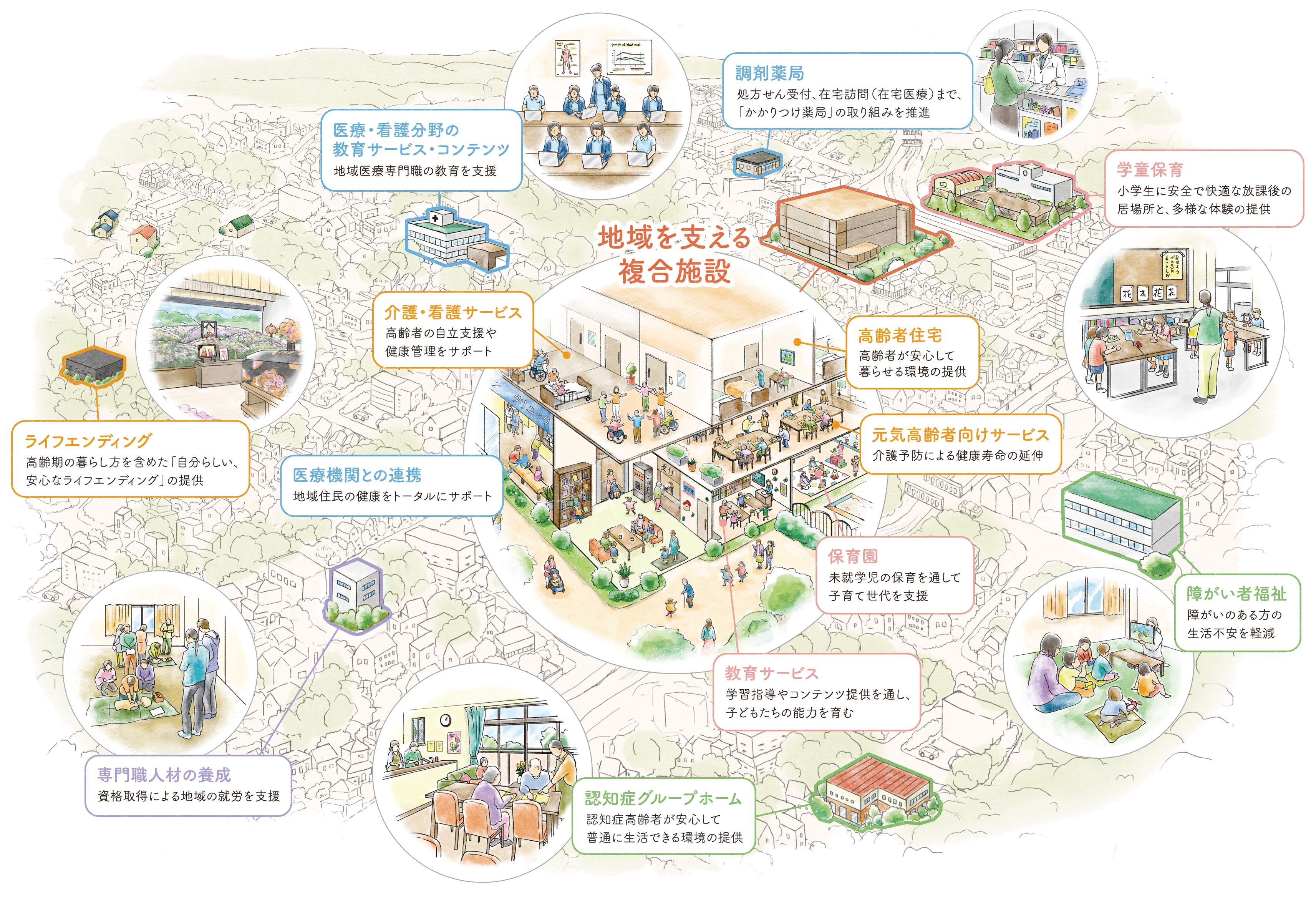 当グループのリソースを一体化し、地域と連携しながら包括的に暮らしのサポートを行う学研独自の街づくりです。
