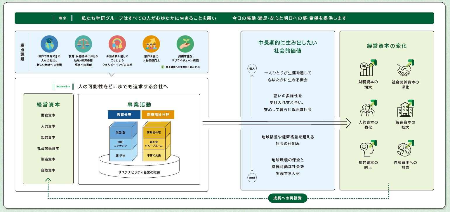 学研グループの価値創造プロセスは、事業活動が社会的価値創造に直結する「ダブル・マテリアリティの追求」の哲学のもとに構成されています。 事業活動を通じて、まず社会的価値が生まれ、その先に経営資本の変化があるという特徴を持っています。